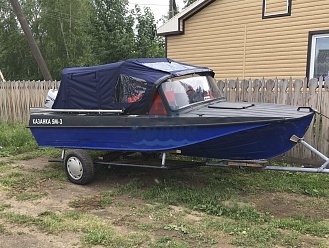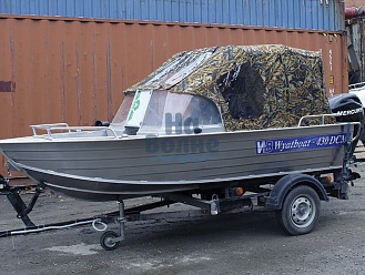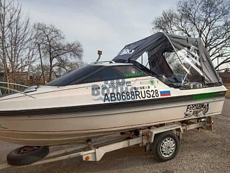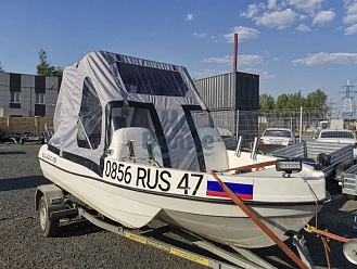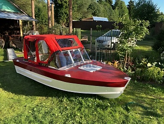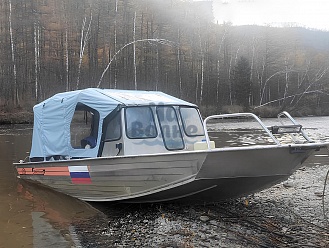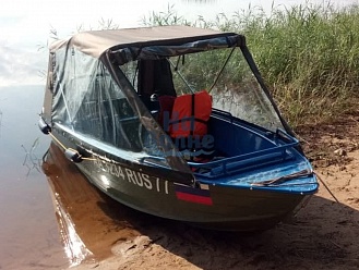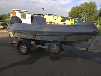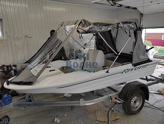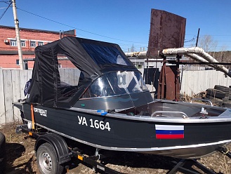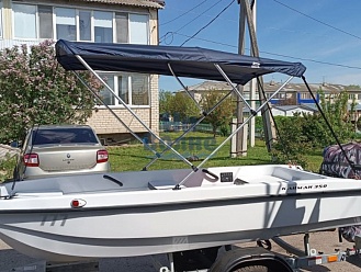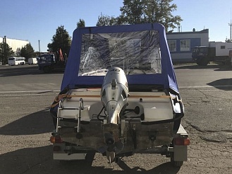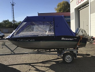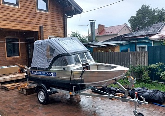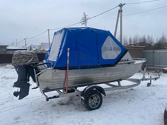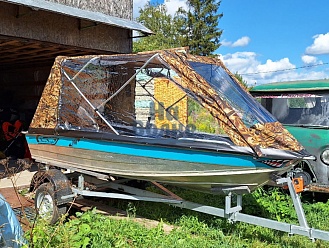Тент с задней дверью для выхода к мотору, небольшими боковыми окнами и усиленными краями для установки застёжек. Изготовлен из специализированной тентовой ткани Оксфорд 600 повышенной плотности