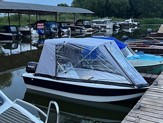 Прозрачные боковины и окно над ветровым стеклом обеспечивают отличный обзор и естественное освещение. Легкий доступ к кормовой части лодки через заднюю откидную дверь. Вентиляционные клапаны и боковые молнии обеспечивают комфорт и удобство. Чехол-банан для надежной защиты и удобного хранения.